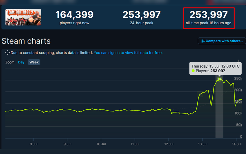 Wczoraj w Team Fortress 2 grało jednocześnie 254 000 osób, co jest absolutnym rekordem dla gry w całym okresie jej istnienia. W chwili pisania tego tekstu w TF2 gra 160 000 graczy. Chociaż gra konsekwentnie osiągała 100 000 osób każdego dnia przez cały lipiec, wydanie nowej aktualizacji przyciągnęło wiele uwagi graczy, którzy mogą pozostać w grze jeszcze przez jakiś czas.