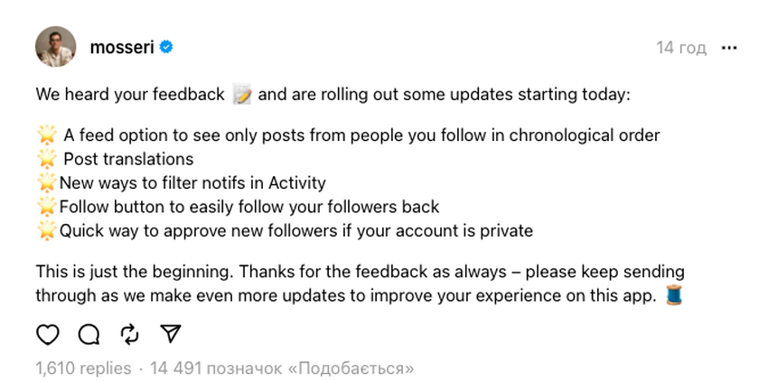 Główną innowacją jest zakładka Following Feed, która pozwala zobaczyć posty subskrybowanych kont w porządku chronologicznym. Ponadto aplikacja dodała możliwość tłumaczenia tekstu na różne języki, zaawansowane ustawienia powiadomień, przycisk Obserwuj na liście subskrybentów i nie tylko.