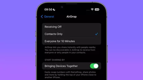 Również w iOS 17 Beta 4 dodano sekcję Rozpocznij udostępnianie przez do menu AirDrop, które zawiera przełącznik Bringing Devices Together. Umożliwia on ręczne włączanie i wyłączanie funkcji NameDrop.