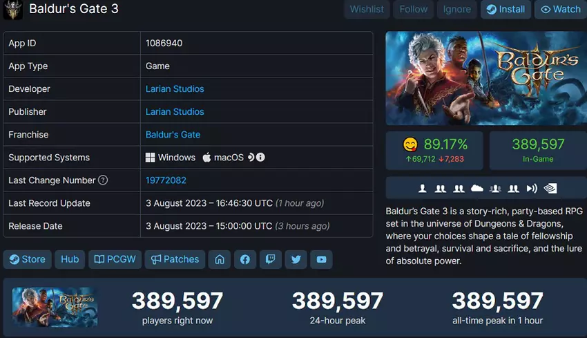 Według statystyk SteamDB, w chwili pisania tego materiału liczba jednoczesnych graczy Baldur's Gate III wynosiła blisko 390 tysięcy osób. Co więcej, liczba ta stale rośnie.