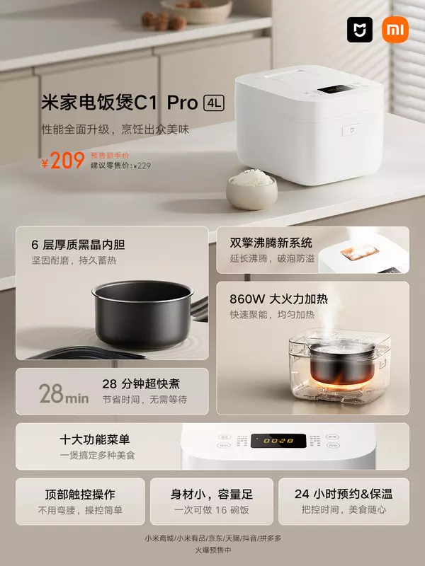 Według firmy, dzięki MiJia Electric Rice Cooker C1 Pro 4L można ugotować 16 porcji ryżu w 28 minut. W górnej części urządzenia znajdują się dotykowe przyciski sterujące i mały wyświetlacz. Nowość obsługuje do 10 różnych menu gotowania. Ponadto urządzenie do gotowania ryżu może utrzymywać ciepło do 12 godzin.