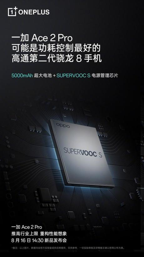 Firma ogłosiła również, że OnePlus Ace 2 Pro będzie wyposażony w baterię o pojemności 5000 mA*h. Moc szybkiego ładowania wyniesie 150W. Odpowiedni zasilacz będzie dołączony do zestawu. Bateria zostanie naładowana w 17 minut.