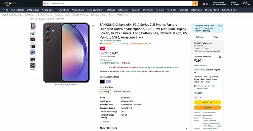 Mowa o modelu Galaxy A54 5G. Urządzenie kosztuje teraz check price on amazon dolarów 449 check price on amazon. Dostępne są dwa kolory, Awesome Black i Awesome Violet.