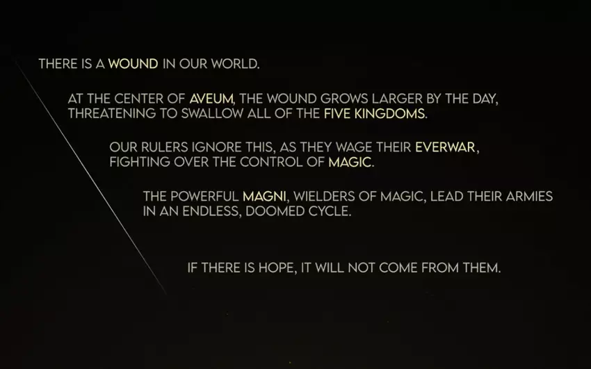 Gra rozpoczyna się od krótkiego wyjaśnienia tego, co się tutaj dzieje. W centrum Aveum znajduje się tajemnicza rana, która powiększa się każdego dnia, grożąc pochłonięciem królestw. Ale władcy to ignorują. Walczą tylko o kontrolę nad magią w wiecznej wojnie i nie ma dla nich nadziei.