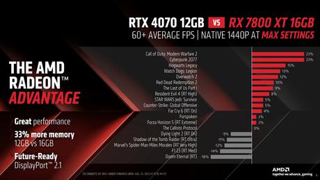 Według producenta, Radeon RX 7800 XT jest średnio o 3,5% wydajniejszy w porównaniu do NVIDIA GeForce RTX 4070 w grach QHD przy maksymalnych ustawieniach graficznych. W Call of Duty: Modern Warfare 2 i Cyberpunk 2077 przewaga ta sięga 23%. Jednak po aktywowaniu technologii ray tracingu, "zielona" karta graficzna mści się w niektórych grach.