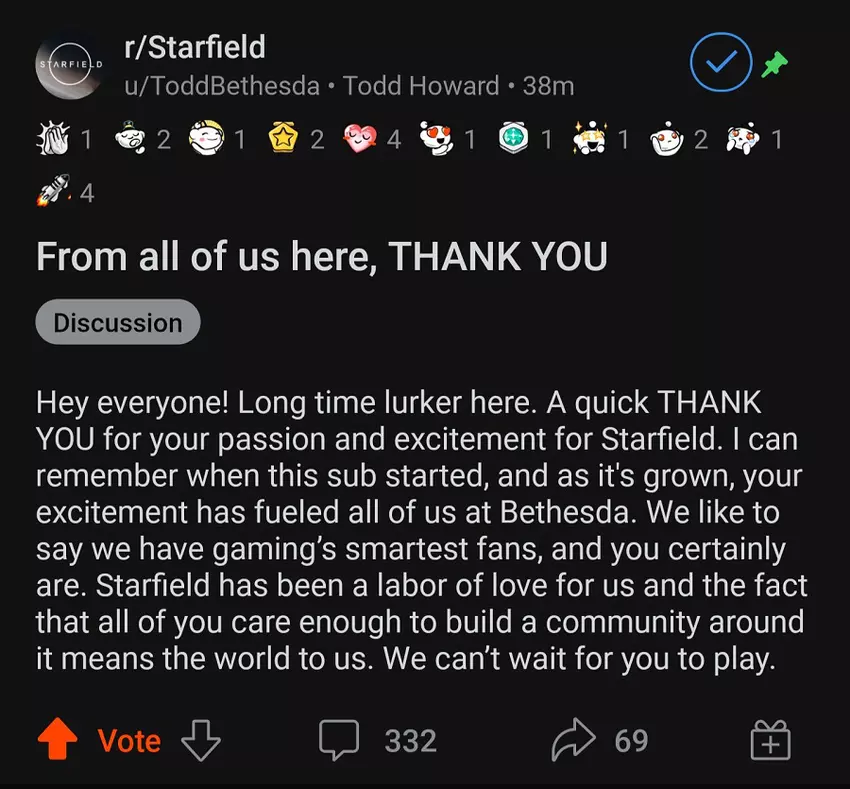 W swojej wiadomości słynny deweloper dziękuje graczom za cierpliwe oczekiwanie na grę przez wiele lat i ogólnie za wsparcie kreatywności Bethesdy. Ponadto Todd Howard nazwał fanów gier swojej firmy "najmądrzejszymi graczami".