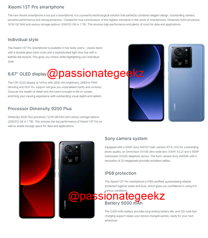 Informator ujawnił szczegółową specyfikację Xiaomi 13T Pro: wyświetlacz OLED 144 Hz, stopień ochrony IP68, układ Dimensity 9200+ i do 1 TB pamięci