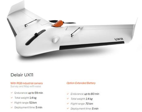 Pierwszy UAV to Delair UX11 (na zdjęciu powyżej). Może latać przez 59 minut i waży zaledwie 1,4 kg. Jego zasięg wynosi 53 kilometry. Dodatkowa bateria wydłuża czas lotu do 80 minut i zasięg do 70 km.