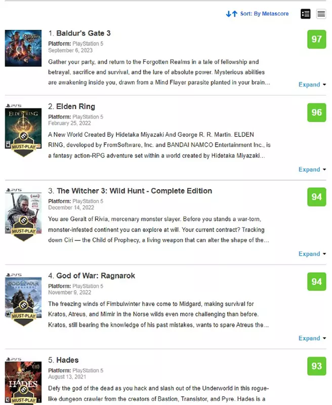 Pierwsza piątka najlepiej ocenianych gier na PS5 na Metacritic wygląda następująco: