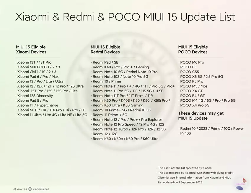 Oczekuje się, że Xiaomi zaprezentuje swoją nową autorską powłokę MIUI 15 w listopadzie. I choć firma nie opublikowała jeszcze listy urządzeń, które otrzymają aktualizację, zasób XiaomiUI już to zrobił. Lista ta nie jest oficjalna, ale opiera się na przypuszczeniach i wcześniejszych wzorcach. Być może z czasem zostanie zaktualizowana, ale XiaomiUI pisze, że lista jest w 99% poprawna.