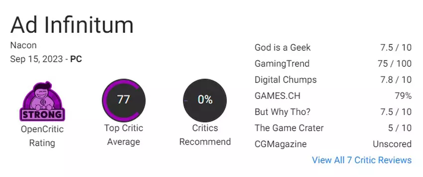 Ad Infinitum otrzymało 77 punktów (na 100) na Opencritic, z 0% rekomendacji (może to usterka strony), na Metacritic gra ma 75 punktów.