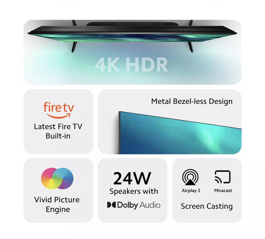 Mowa o 43-calowej wersji Smart Fire TV 4K. Nowość otrzymała technologię Vivid Picture Engine, a także 24-watowe głośniki z obsługą Dolby Audio, DTS-HD i DTS: Virtual X. Telewizor działa na systemie operacyjnym Fire TV OS 7. Nowość posiada Wi-Fi 802.11 ac (2,4/5 GHz), AirPlay 2, Miracast, Bluetooth 5.0, a także porty HDMI, USB 2.0 i 3,5 mm. Urządzenie jest fabrycznie wyposażone w aplikacje Prime Video, Netflix, Disney+ i YouTube.