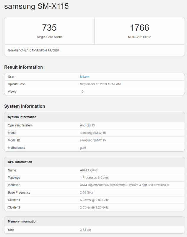 Mówimy o Galaxy Tab A9. Nowość przechodzi z numerem modelu SM-X115. Według raportu gadżet będzie wyposażony w 4 GB pamięci RAM i system operacyjny Android 13. Jeśli chodzi o procesor, będzie to SoC z sześcioma rdzeniami 2,0 GHz, dwoma rdzeniami 2,20 GHz i grafiką Mali-G57 MC2. Model układu nie został określony w raporcie, ale wydaje się, że jest to procesor MediaTek Helio G99.