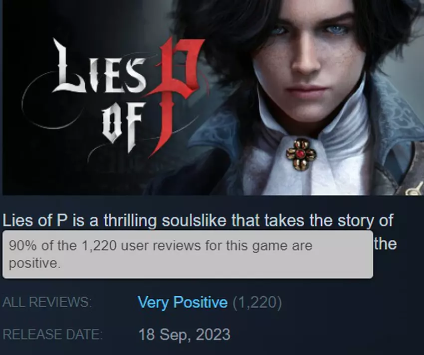 Wcześniej gra otrzymała wysokie noty od krytyków, a teraz swoimi opiniami dzielą się również gracze. Zgodnie z oczekiwaniami, użytkownicy Steam są niezwykle zadowoleni z Lies of P i pozostawili już ponad tysiąc recenzji, z których 90% jest "niezwykle pozytywnych".