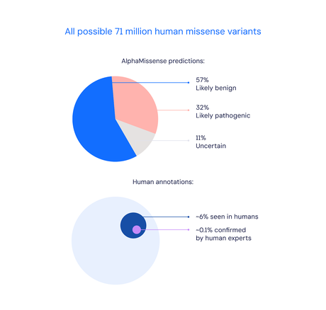 Naukowcy wykorzystali AlphaMissense do przeanalizowania 71 milionów potencjalnych jednoliterowych mutacji u ludzi. Sztuczna inteligencja przewidziała z 90-procentową dokładnością, że 57% z nich jest nieszkodliwych, a 32% szkodliwych.