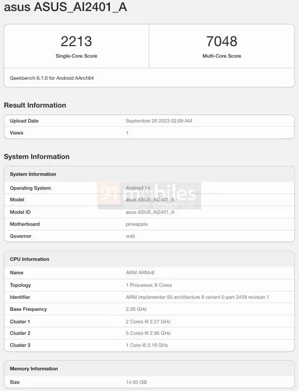 Smartfon ma numer modelu ASUS _AI2401_A. Jest wyposażony w mobilny procesor Qualcomm Snapdragon 8 Gen 3, który otrzyma architekturę 1 + 5 + 2 zamiast 1 + 3 + 4. Flagowy układ nowej generacji zostanie oficjalnie zaprezentowany za miesiąc na konferencji Snapdragon Tech Summit.