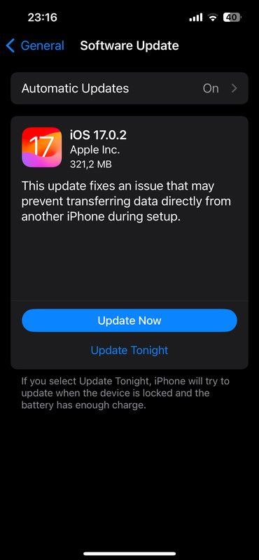 System otrzymał nazwę iOS 17.0.2 i numer kompilacji 21A351. Jest to druga wersja oprogramowania po wydaniu iOS 17. Zgodnie z listą zmian Apple, firmware naprawił drobne błędy, a także problem, który uniemożliwiał przesyłanie danych bezpośrednio z innego iPhone'a podczas pierwszej konfiguracji urządzenia.