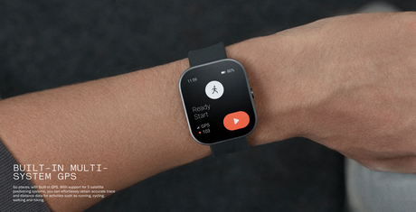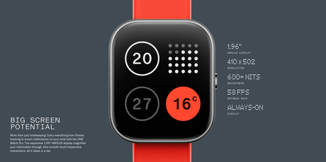 Nowość ma minimalistyczny wygląd, plastikową obudowę z wykończeniem ze szczotkowanego aluminium lub polerowanego połysku (do wyboru). Zegarek posiada duży 1,96-calowy wyświetlacz AMOLED o rozdzielczości 410×502p i częstotliwości odświeżania 58Hz. Deklarowana jasność ekranu wynosi 600 nitów. Nowość posiada moduł GPS, a także różne czujniki do śledzenia wskaźników zdrowotnych, w tym tętna, SpO2 i stresu. Zegarek może monitorować sen i różne rodzaje aktywności.