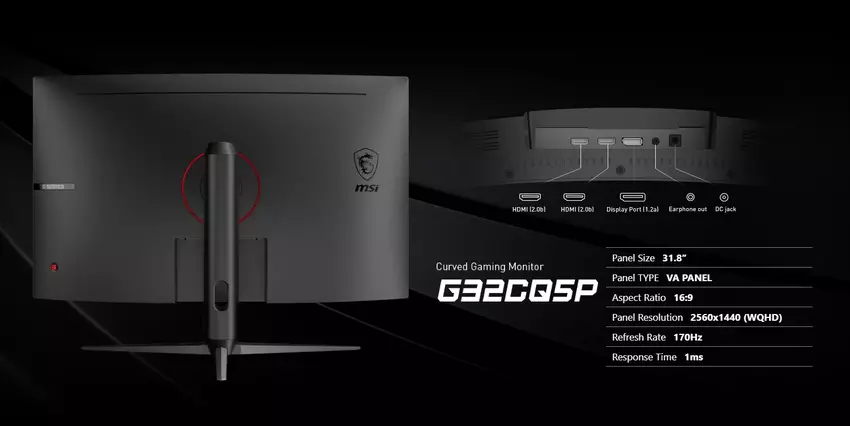 MSI G32CQ5P posiada wsparcie dla Adaptive-Sync i HDR. Do podłączenia służy jedno złącze DisplayPort 1.2a i dwa HDMI 2.0b z obsługą odpowiednio 1440p@170FPS i 1440p@144FPS. Monitor posiada również wyjście słuchawkowe.