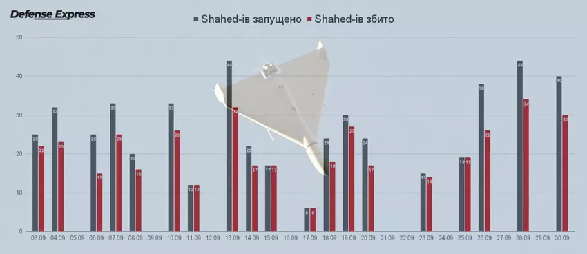 Według Defence Express, we wrześniu Rosja wystrzeliła rekordową liczbę 503 bezzałogowych statków powietrznych na terytorium Ukrainy. Dla porównania, wcześniej rekord wynosił 413 dronów (w maju 2023 r.). Pomimo tak dużej liczby dronów ukraiński system obrony powietrznej był w stanie zniszczyć 396 celów. Oznacza to, że skuteczność obrony powietrznej wynosi 78,7%.