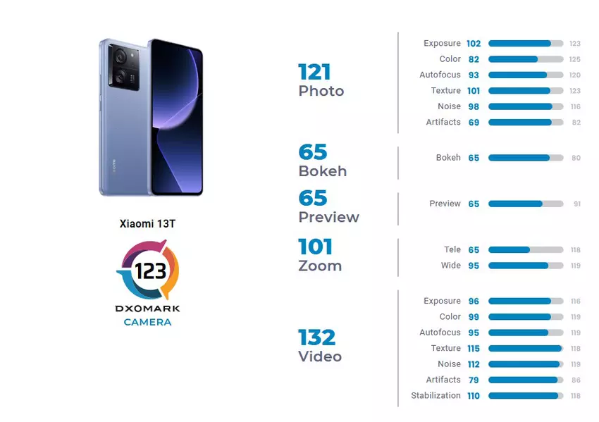 Ogólny wynik gadżetu to 123 punkty: 134 punkty za zdjęcia i tylko 114 za filmy. Wydajność aparatu Xiaomi 13T jest szczególnie imponująca pod względem ekspozycji, kontrastu, balansu bieli, zachowania szczegółów, autofokusa, zakresu dynamicznego i redukcji szumów. Aparat ma jednak trudności z zapewnieniem dokładnych kolorów w złożonych scenach i występuje pewna utrata szczegółów przy słabym oświetleniu.
