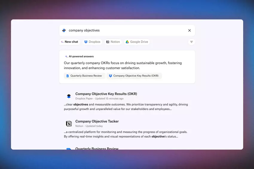 Nowe narzędzia AI obejmują otwartą wersję beta uniwersalnego inteligentnego wyszukiwania Dash, które pomaga znaleźć potrzebne pliki w aplikacjach i kartach przeglądarki. Kolejna aktualizacja dotyczy aplikacji AI Dropbox, która może teraz dostarczać ogólnych informacji o plikach użytkownika w odpowiedzi na jego pytania.