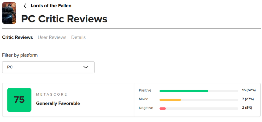 Na Opencritic gra otrzymała 71% na 100%, a 67% krytyków ją poleciło. Tam, jak i na Metacritic, są tacy, którzy zachwycają się grą i nazywają ją jedną z najlepszych w swoim gatunku, ale jest też druga strona, która nazywa Lords of the Fallen kopią Dark Souls.