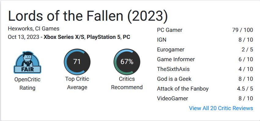 13 października ukaże się pełna wersja soulslike'owego Lords of the Fallen, będącego wznowieniem wydanej w 2014 roku gry o tej samej nazwie. Dzień przed premierą krytycy opublikowali recenzje gry. Średnia ocena Lords of the Fallen wynosi 7 punktów.