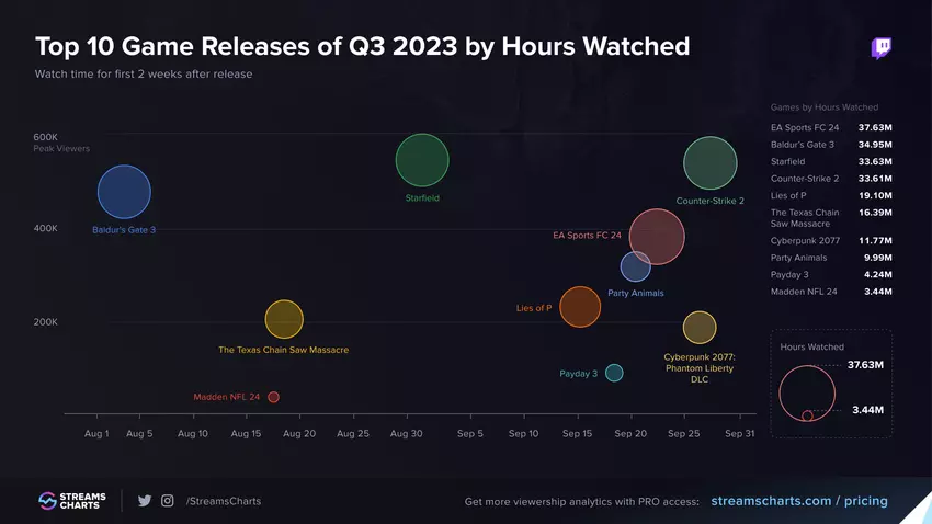 Portal analityczny Streams Charts opublikował ranking najpopularniejszych gier na Twitchu, które zostały wydane w trzecim kwartale 2023 roku. Portal bierze jednak pod uwagę tylko pierwsze dwa tygodnie po premierze, ponieważ niektóre gry zostały wydane ponad miesiąc temu, podczas gdy inne pojawiły się niedawno.