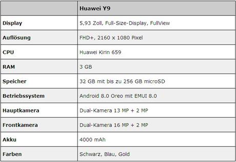 Y9 otrzymał 5, 93-calowy wyświetlacz IPS z Współczynnik kształtu 18: 9, a rozdzielczość 2160 × 1080 pikseli. Urządzenie pracuje na Procesor 659 w Kirin Istnieje również 3 GB i RAM przechowywać na 32 GB, ale pojemność pamięci może zostać zwiększona do PL 256 z za pomocą karty microSD.
