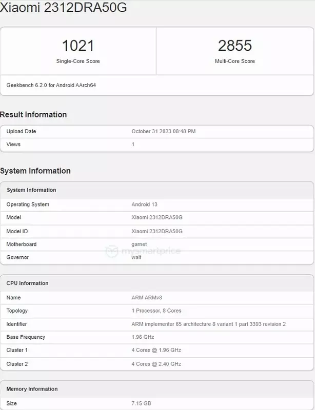 Smartfon ma numer modelu 2312DRA50G. Ostatni symbol oznacza, że działa na globalnym oprogramowaniu MIUI 14. Wynik w teście wydajności wyniósł 1021 i 2855 punktów odpowiednio w trybach Single-Core i Multi-Core.