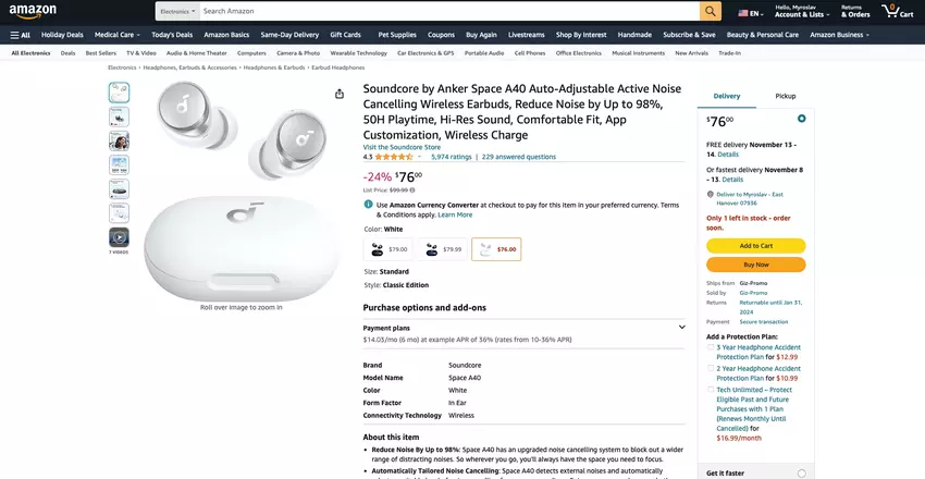 Soundcore by Anker Space A40 z adaptacyjnym ANC i do 50 godzin pracy na baterii jest dostępny na Amazon za 76 USD (23 USD zniżki).