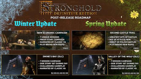 W planach są dwa duże dodatki (kosztujące zaledwie 3 dolary) do Stronghold: Swine's Bay i Valley of the Wolf, a także szereg darmowych aktualizacji, w tym kampania ekonomiczna i zaktualizowany szlak Drugiego Zamku.