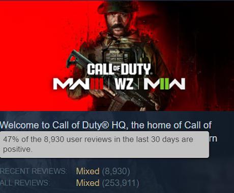 Użytkownicy Steam spotkali się z negatywnymi recenzjami Call of Duty: Modern Warfare III (2023). Gracze są niezadowoleni z nudnej i niezwykle krótkiej (niecałe 4 godziny) kampanii fabularnej, przeciętnego trybu zombie i niezwykle wysokich wymagań systemowych, a wszystko to za cenę 70 dolarów.