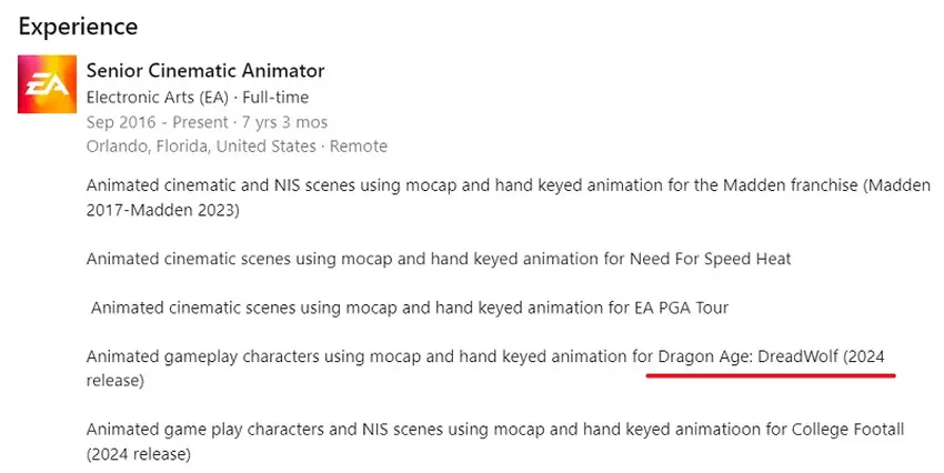 Na stronie LinkedIn starszego animatora filmowego EA Kevina Scotta (Kevin Scott) wskazano, że premiera Dragon Age: Dreadwolf jest zaplanowana na 2024 rok.