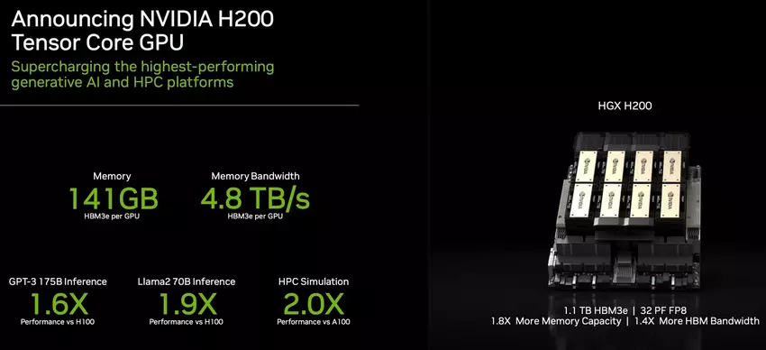 Dzięki temu przepustowość pamięci wzrosła do 4,8 Tbyte/s w porównaniu do 3,35 Tbyte/s w H100. Całkowita pojemność wzrosła z 80 GB do 141 GB.