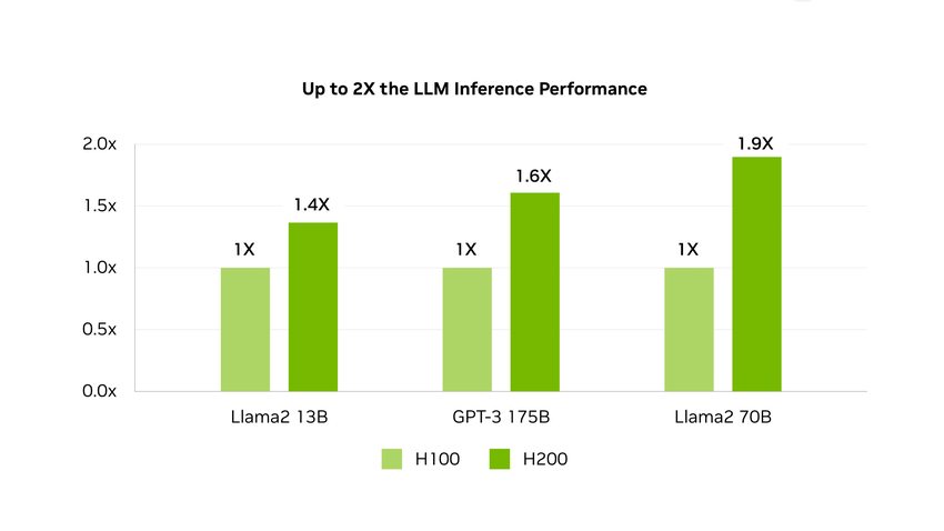 NVIDIA twierdzi, że nowy układ zapewnia prawie dwukrotny wzrost wydajności w zadaniach generatywnej sztucznej inteligencji w porównaniu do H100. Ocena opiera się na testach modeli językowych GPT-3 i Llama 2.