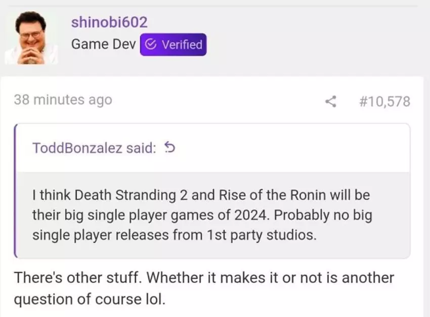 Na forum ResetEra Shinobi602 poinformował, że gra akcji Rise Of The Ronin od japońskiego studia Team Ninja i Death Stranding 2, nad którą pracuje słynny projektant gier Hideo Kojima, zostaną wydane w 2024 roku.