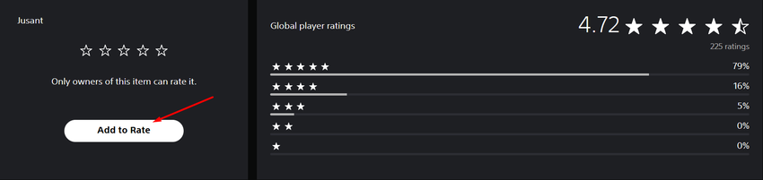 Po otwarciu strony gry w internetowej wersji PS Store zobaczysz jej ogólną ocenę i liczbę graczy, którzy ją ocenili, a także możesz wystawić jej własną ocenę. Aby to zrobić, przewiń stronę nieco w dół, gdzie znajdziesz sekcję "Ocena". Następnie należy kliknąć "Dodaj do oceny" i przyznać od 1 do 5 gwiazdek.