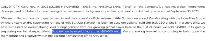 Z raportu finansowego wydawcy Snail dowiedzieliśmy się, że na dzień 14 listopada sprzedano ponad 600 tysięcy kopii ARK: Survival Ascended.