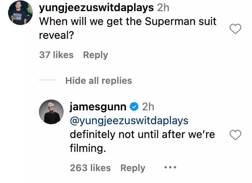 Według samego Gunna, fani będą musieli poczekać co najmniej kilka miesięcy. W odpowiedzi na pytanie fana pod jednym z ostatnich postów Gunna na Instagramie, reżyser powiedział, że fani nie zobaczą nawet podpowiedzi, jak będzie wyglądał kostium, dopóki nie rozpocznie się kręcenie "Superman: Legacy".