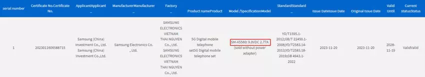 W dokumentach Galaxy A55 5G przechodzi z numerem modelu SM-A5560. Smartfon będzie wyposażony w obsługę szybkiego ładowania 25W. Nawiasem mówiąc, dokładnie takie samo ładowanie ma obecny smartfon Galaxy A54 5G.