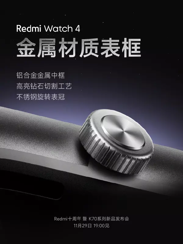 Redmi opublikowało kilka nowych zdjęć w mediach społecznościowych, które ujawniają główne cechy Redmi Watch 4. Przede wszystkim jest to pierwszy zegarek marki z metalową obudową. Jest również specjalnie reklamowany jako posiadający metalową koronę o szlifie diamentowym, która umożliwia nawigację po menu.
