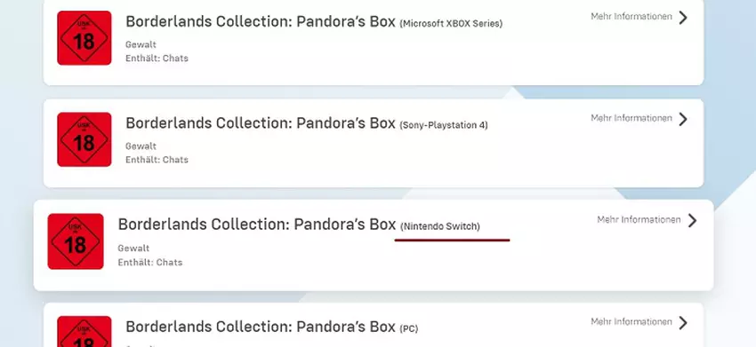 Strona internetowa niemieckiej komisji ratingowej USK ujawniła, że Borderlands Collection: Pandora's Box otrzymała również certyfikat dla Nintendo Switch.