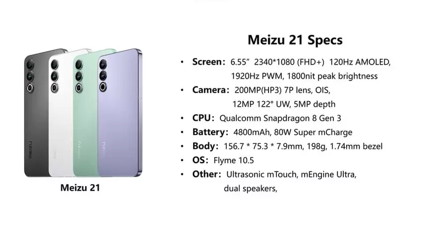 Według przecieków, Meizu 21 otrzyma korpus o wymiarach 156,7×75,3×7,9 mm i wadze 198 gramów. Nowość będzie wyposażona w 6,55-calowy wyświetlacz Full HD+ AMOLED o częstotliwości odświeżania 120 Hz. Panel będzie miał szczytową jasność 1800 nitów. Gadżet będzie wyposażony w układ Snapdragon 8 Gen 3 i baterię o pojemności 4800 mAh. Będzie on obsługiwał szybkie ładowanie 80W.