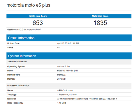 Smartfon przeszedł test wydajności i dzięki temu niektóre jego specyfikacje stały się znane. Moto E5 Plus otrzyma układ msm8937 (Snapdragon 430) z zegarem 1,4 GHz, 3 GB pamięci RAM i systemem Android 8.0 Oreo. Zgodnie z poprzednimi wyciekami smartfon będzie miał także ekran o przekątnej 5,8 cala i proporcji 18: 9 i rozdzielczości HD +. Oczekuje się również 13-megapikselowej kamery głównej i baterii 5000 mAh.