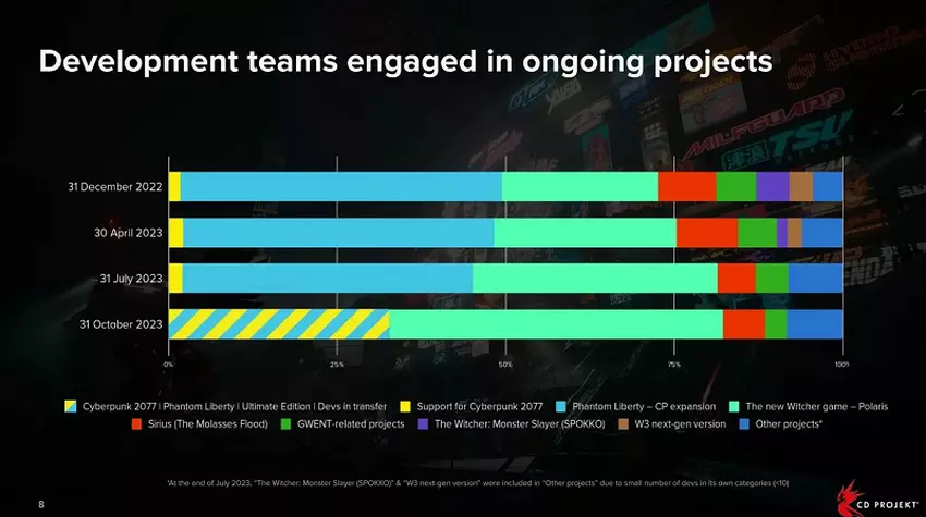 Dyrektor finansowy CD Projekt Piotr Nielubowicz ujawnił, że spółka zwiększa liczbę pracowników pracujących nad kolejną odsłoną serii Wiedźmin. Obecnie w prace nad grą o nazwie kodowej Wiedźmin: Polaris zaangażowanych jest 330 osób, co stanowi ponad połowę wszystkich deweloperów zespołu CD Projekt. Co więcej, do połowy 2024 roku ich liczba ma przekroczyć 400 osób.