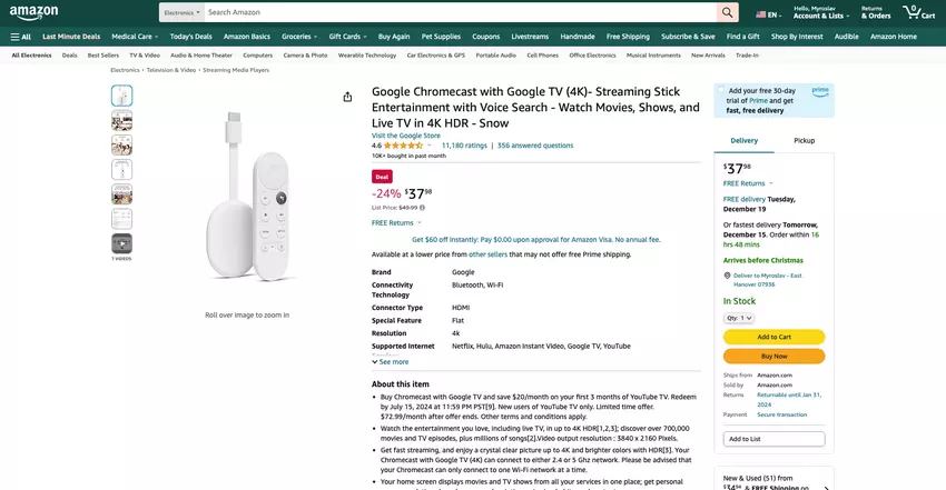 Chromecast z Google TV (4K) jest dostępny na Amazon z rabatem w wysokości 12 USD