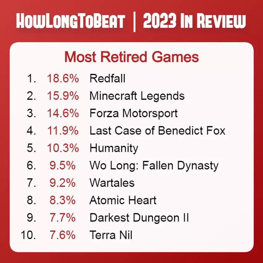 Być może nikogo nie zdziwi fakt, że liderem w tym zestawieniu jest wampirza strzelanka Redfall od Arkane Studios - 18,6% graczy nie było w stanie dotrzeć nawet do połowy gry.