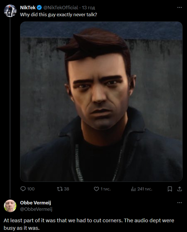 Obbe Vermeij, były deweloper Rockstar, który brał udział w tworzeniu GTA III, powiedział, że powód jest bardzo prosty. Dział audio był bardzo zajęty podczas prac nad grą, więc postanowiono nie dokładać mu dodatkowej pracy, tylko sprawić, by postać była niema.